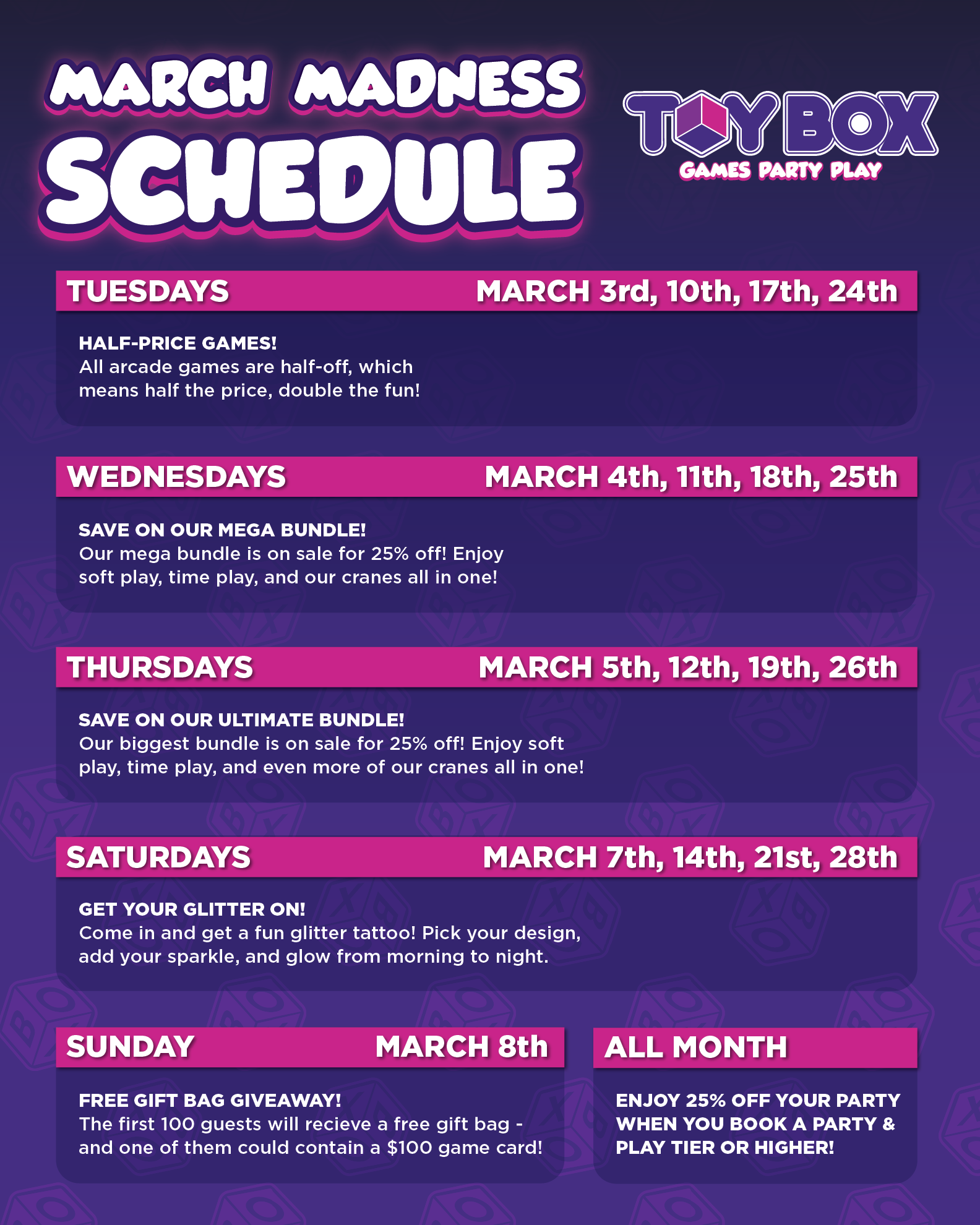 This March, enjoy some awesome deals every week! Save on your next party, game your heart out with our various discounts and deals, or enjoy our fun glitter tattoos every Saturday!
